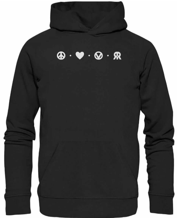 Vegan und Bio Hoodie: Peace -Love - Veganism - RUDE REBEL in Schwarz / Größe S
